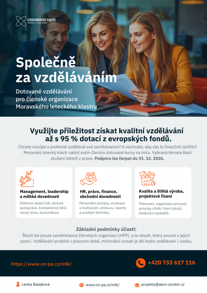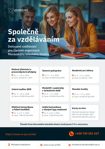 Moravský letecký klastr realizuje projekt zaměřený na systematický rozvoj zaměstnanců členských organizací prostřednictvím profesního vzdělávání s podporou evropských fondů.